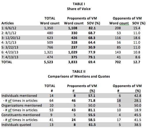 Table I shows proponents enjoying a 69.4% share of voice compared to just 12.7% for opponents in the AP’s coverage. The figures were determined by doing word counts for groupings of similar text (talking points, reference materials, editorial commentary, photo captions, etc.). Neutral text (such as legislation and quotes from people without a discernible point of view), accounts for the difference between the two column totals (on the right) and the total word count (on the left).